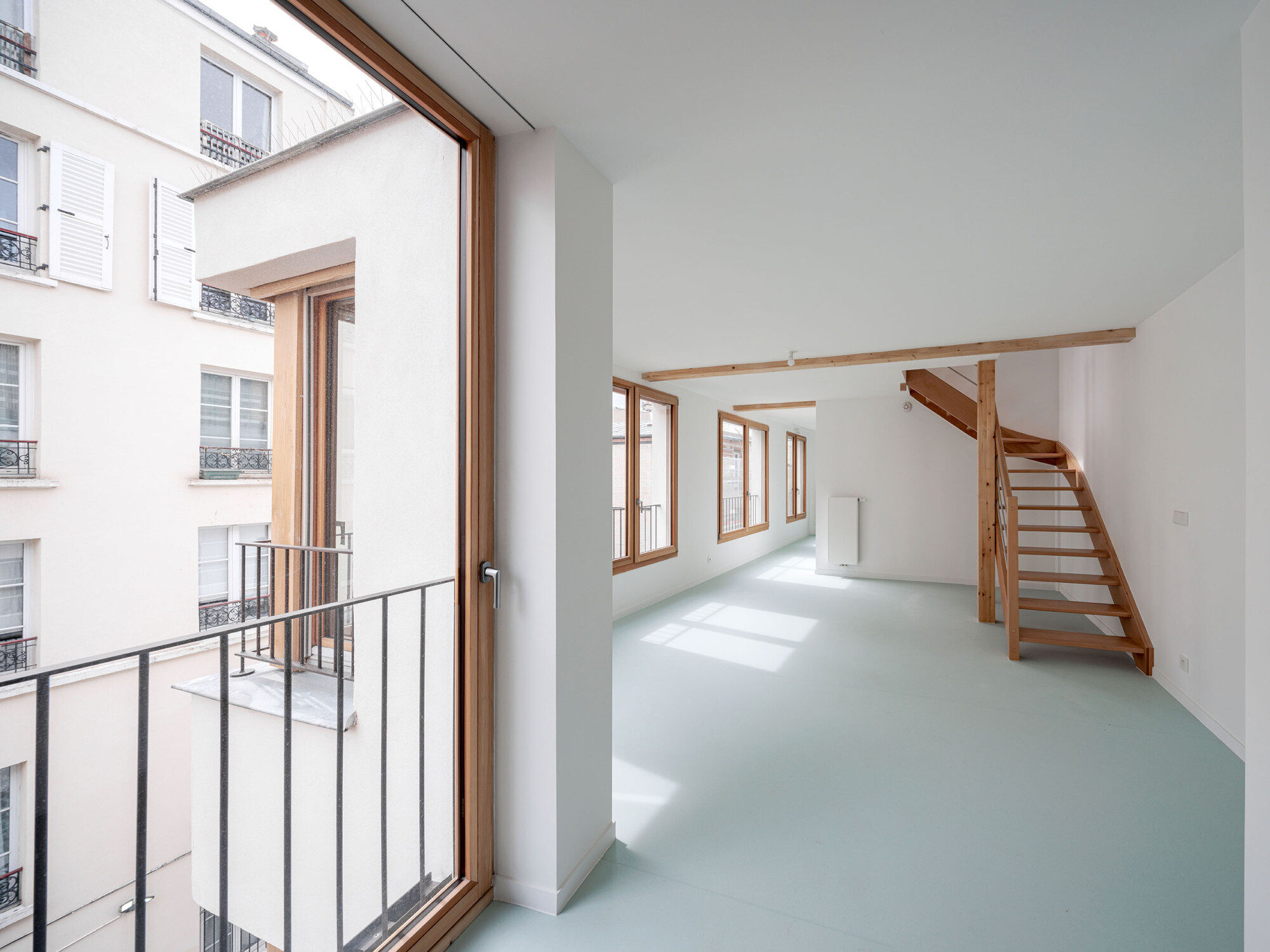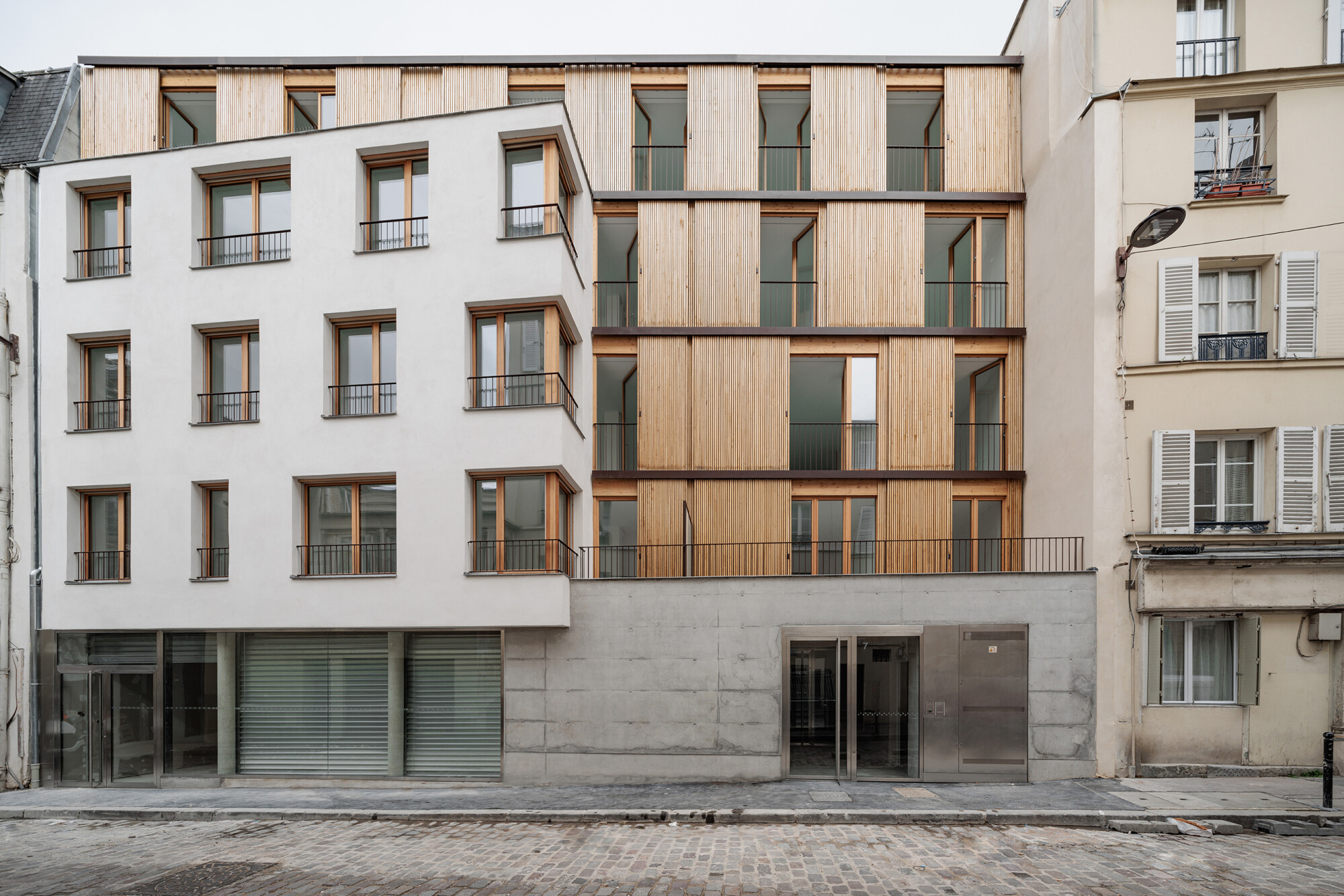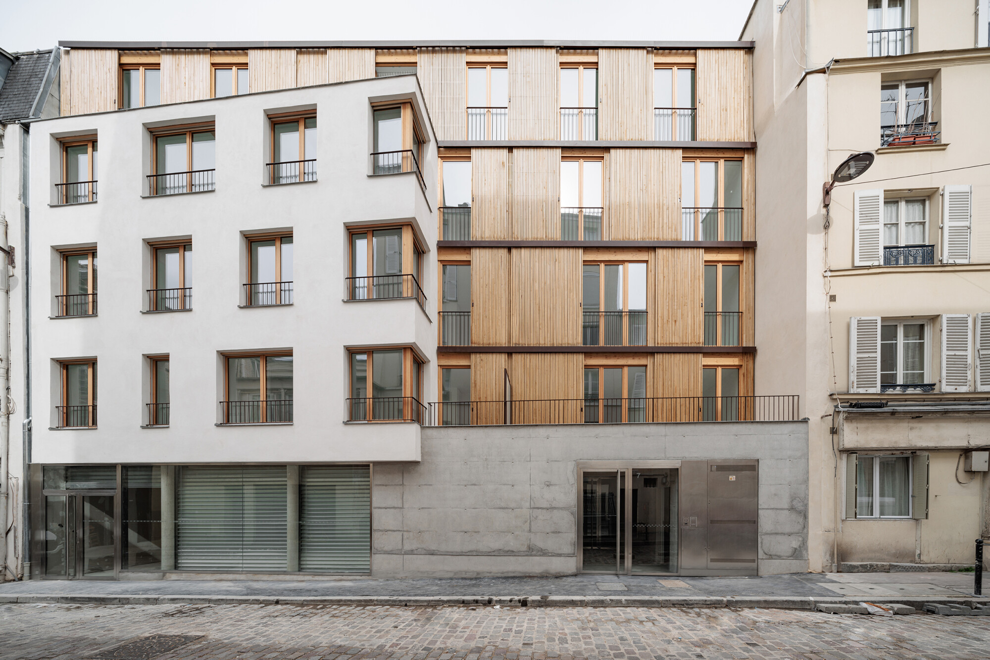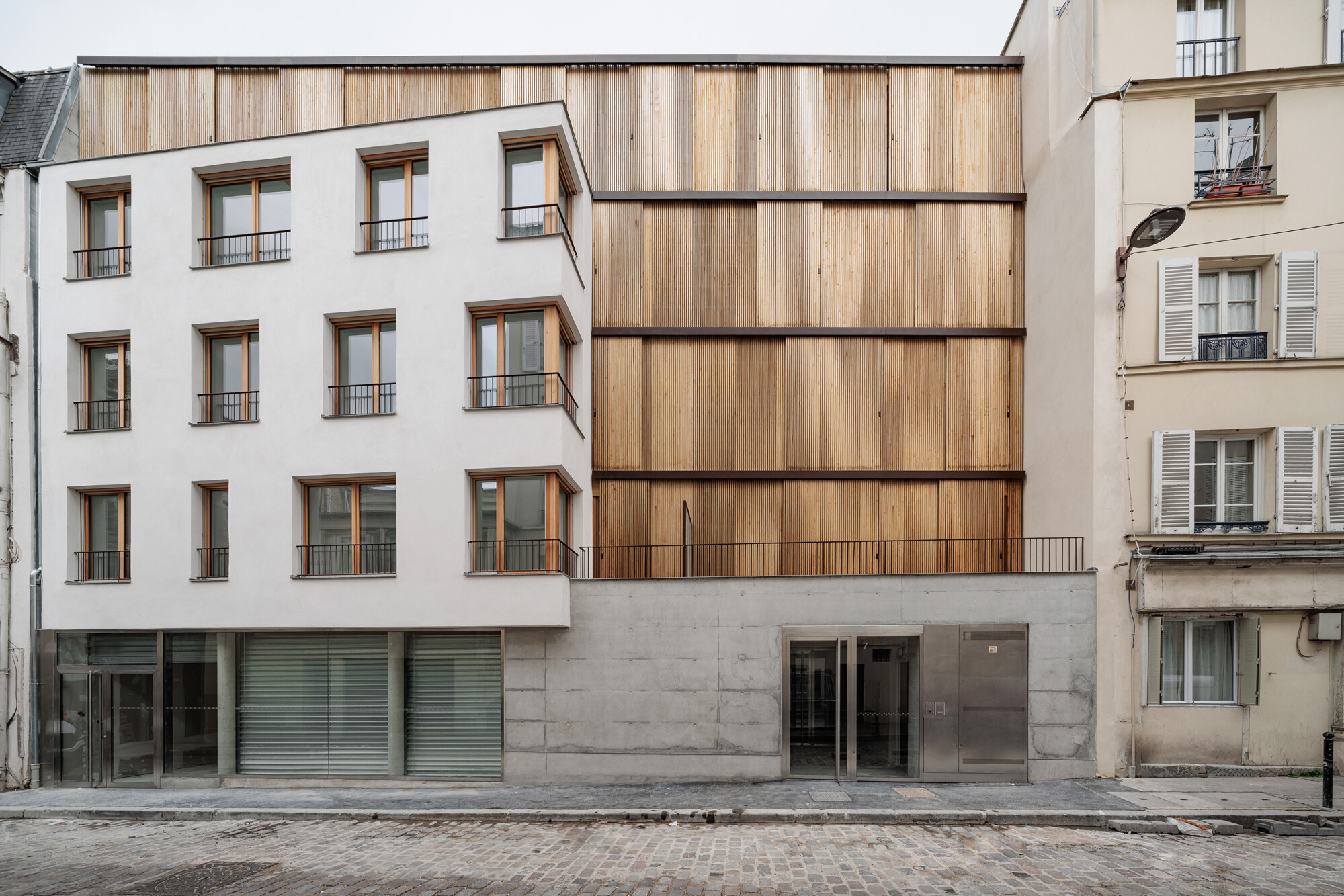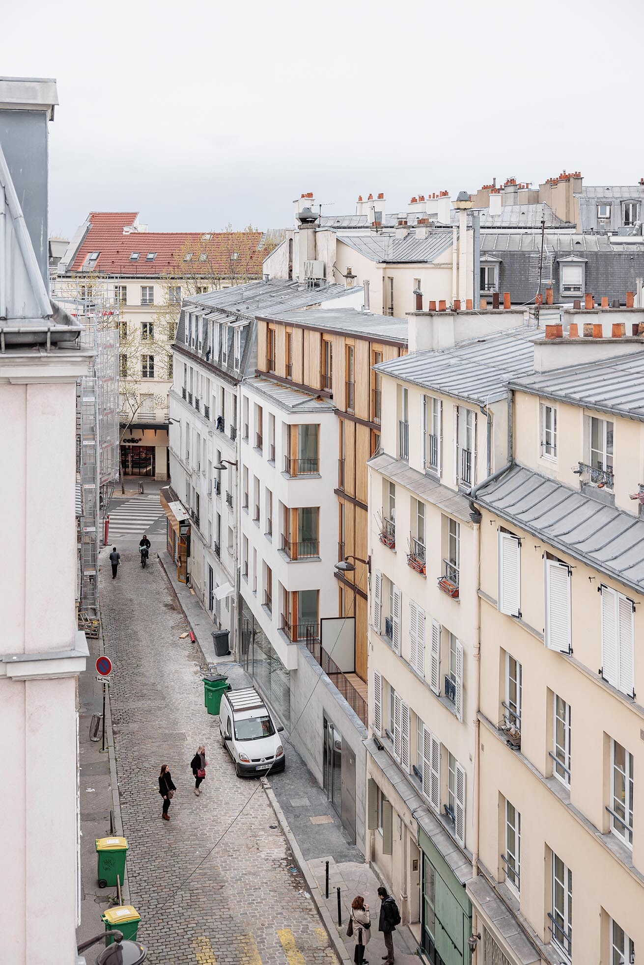 Disposant d’une façade unique, le projet poursuit ce jeu de sédimentation à la recherche de vues biaises et d’orientations multiples. Deux volumétries désaxées s’imbriquent l’une en retrait de l’autre pour dégager des fenêtres d’angle, des terrasses et échapper au vis-à-vis en s’ouvrant vers l’est. Entre continuité et rupture, leurs façades développent des écritures distinctes, fenêtres sur allège et enduit à la chaux en continuité du bâtiment voisin, baies toute hauteur et persiennes habillées de liteaux en châtaignier en retrait. Particulièrement adaptée à l’exiguïté de la parcelle et aux contraintes d’accès, une structure de planchers et murs en ossature bois se pose sur un socle de béton qui s’exprime en façade et reprend l’alignement des rez-de-chaussée artisanaux du passage.