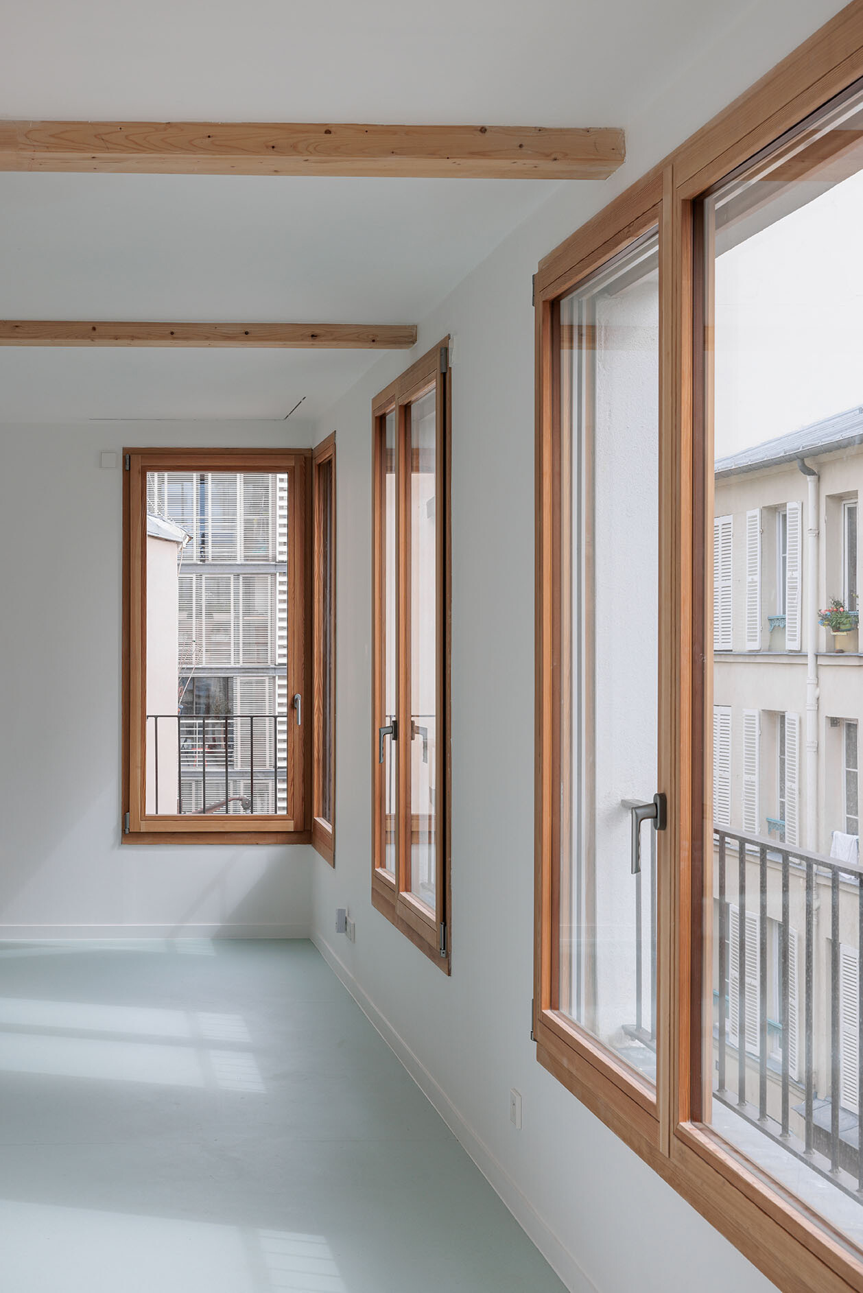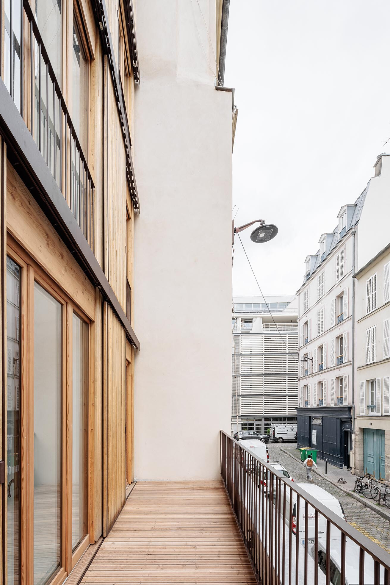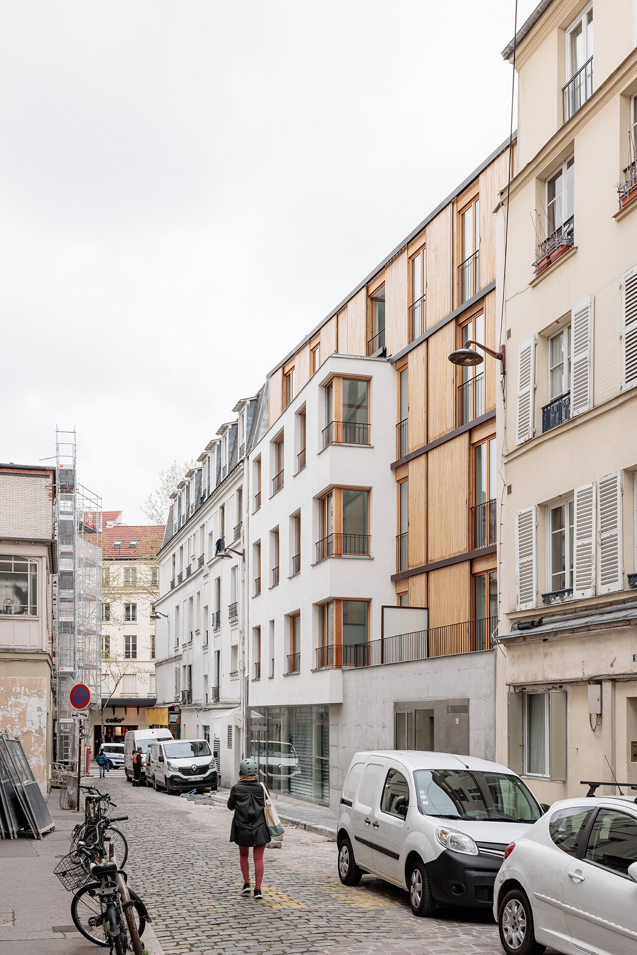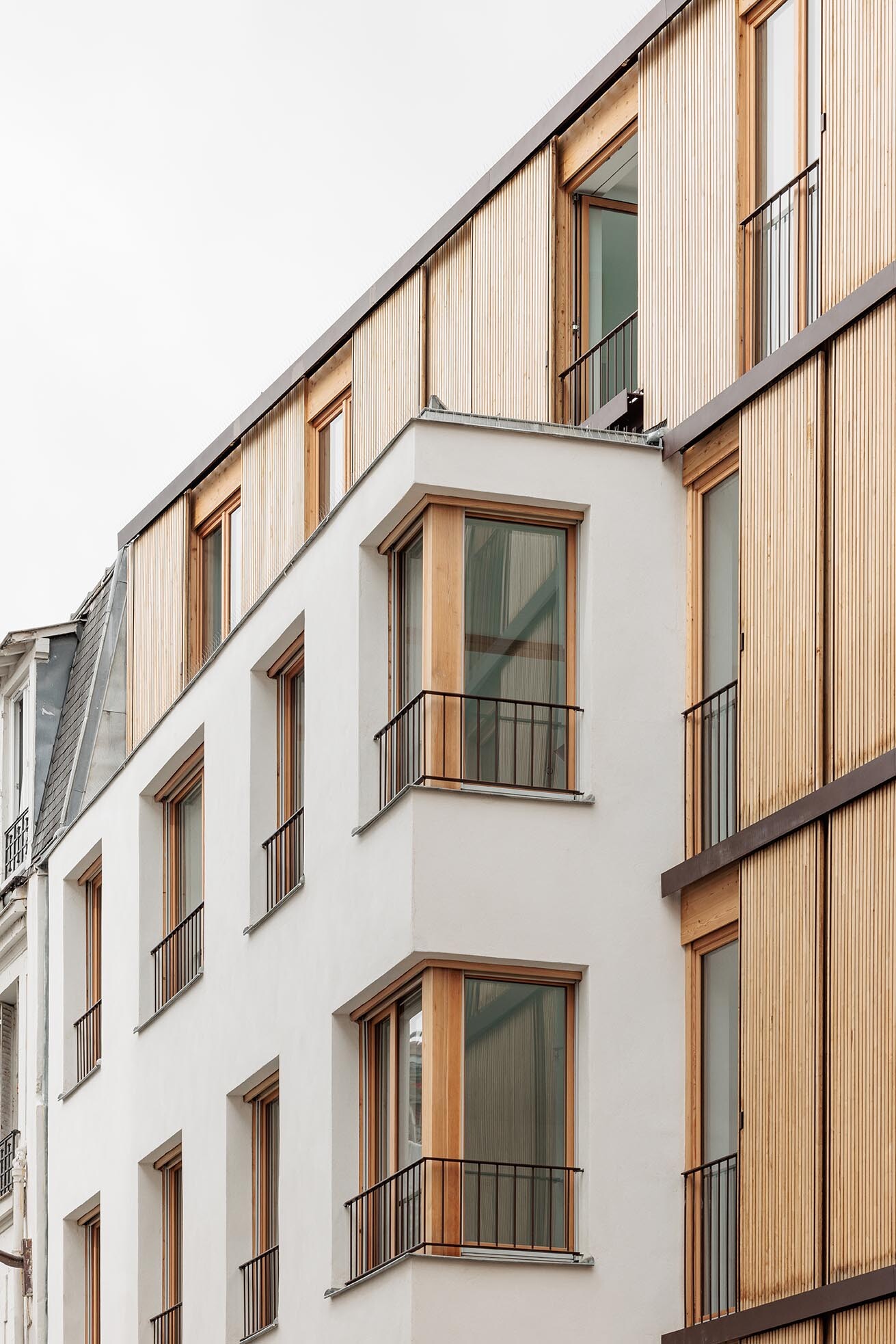 Disposant d’une façade unique, le projet poursuit ce jeu de sédimentation à la recherche de vues biaises et d’orientations multiples. Deux volumétries désaxées s’imbriquent l’une en retrait de l’autre pour dégager des fenêtres d’angle, des terrasses et échapper au vis-à-vis en s’ouvrant vers l’est. Entre continuité et rupture, leurs façades développent des écritures distinctes, fenêtres sur allège et enduit à la chaux en continuité du bâtiment voisin, baies toute hauteur et persiennes habillées de liteaux en châtaignier en retrait. Particulièrement adaptée à l’exiguïté de la parcelle et aux contraintes d’accès, une structure de planchers et murs en ossature bois se pose sur un socle de béton qui s’exprime en façade et reprend l’alignement des rez-de-chaussée artisanaux du passage.
