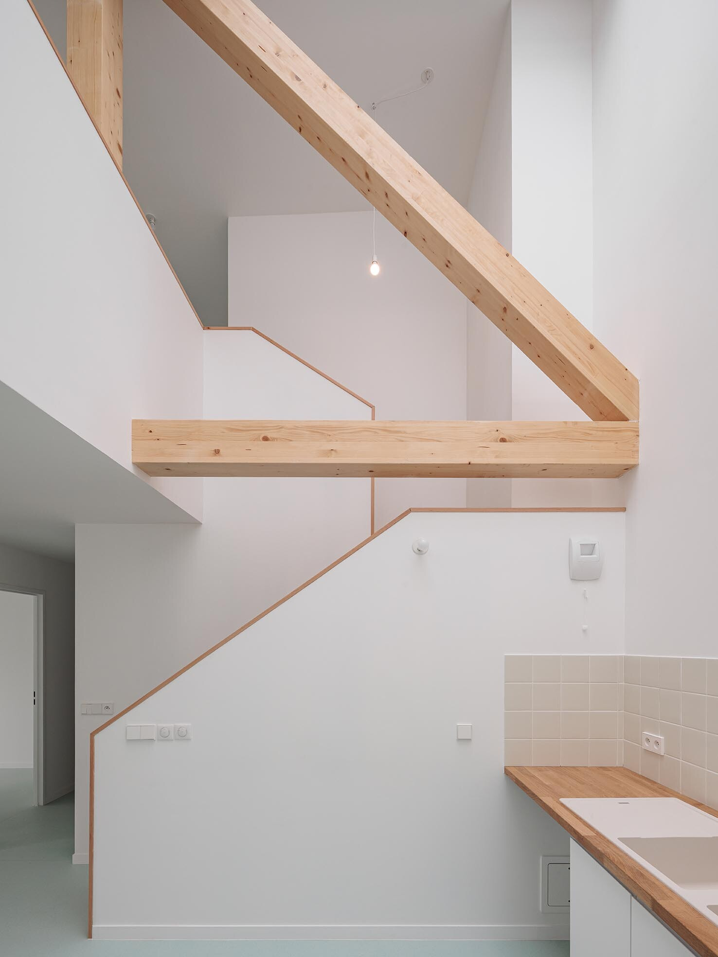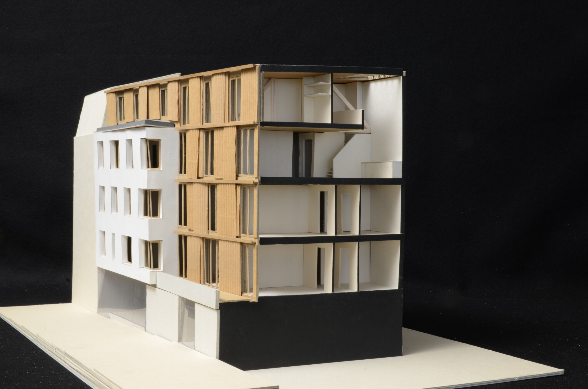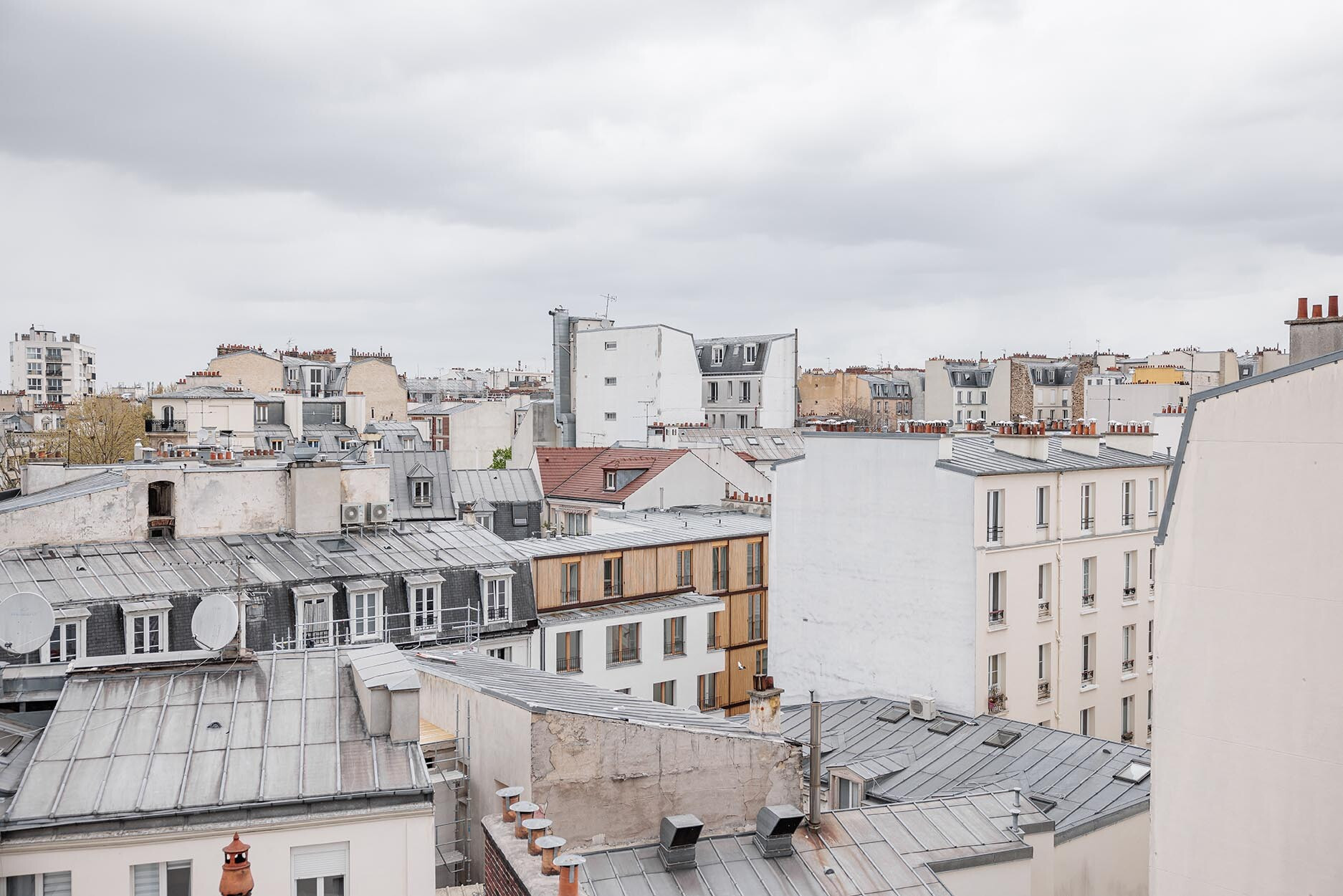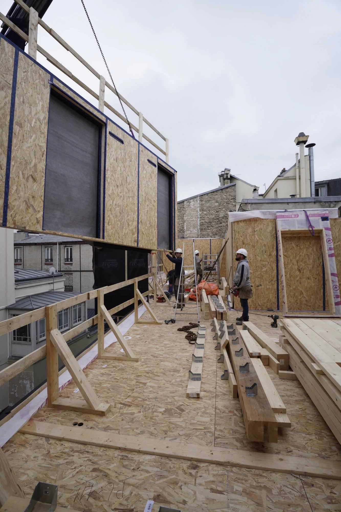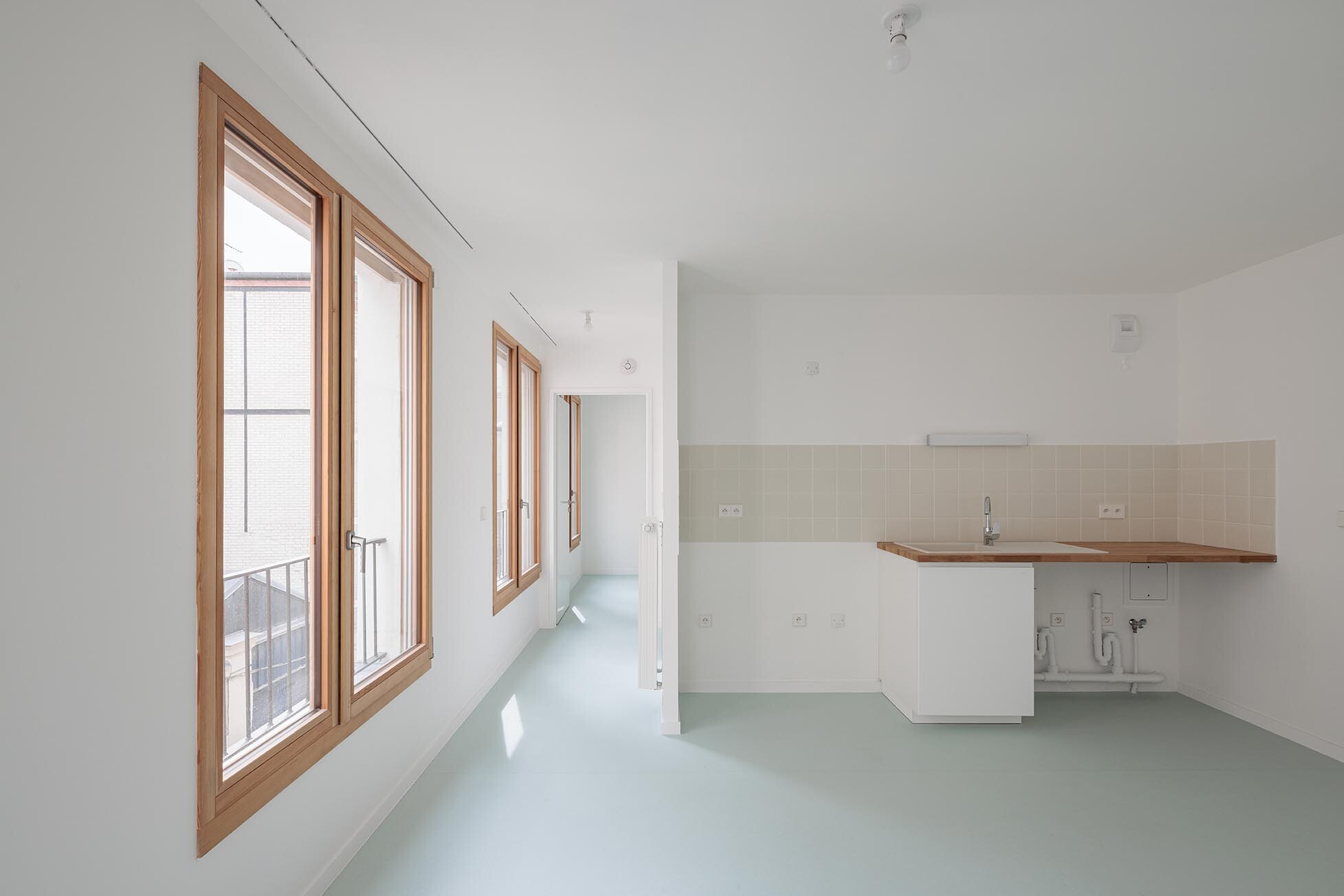 Disposant d’une façade unique, le projet poursuit ce jeu de sédimentation à la recherche de vues biaises et d’orientations multiples. Deux volumétries désaxées s’imbriquent l’une en retrait de l’autre pour dégager des fenêtres d’angle, des terrasses et échapper au vis-à-vis en s’ouvrant vers l’est. Entre continuité et rupture, leurs façades développent des écritures distinctes, fenêtres sur allège et enduit à la chaux en continuité du bâtiment voisin, baies toute hauteur et persiennes habillées de liteaux en châtaignier en retrait. Particulièrement adaptée à l’exiguïté de la parcelle et aux contraintes d’accès, une structure de planchers et murs en ossature bois se pose sur un socle de béton qui s’exprime en façade et reprend l’alignement des rez-de-chaussée artisanaux du passage.