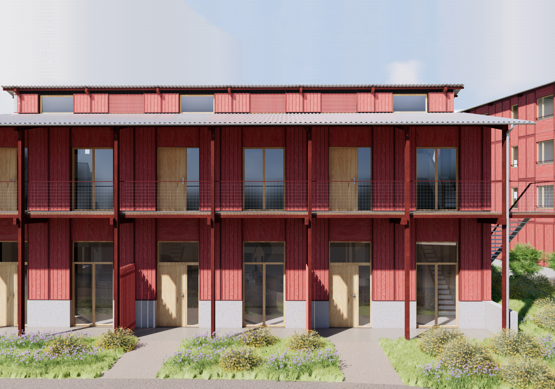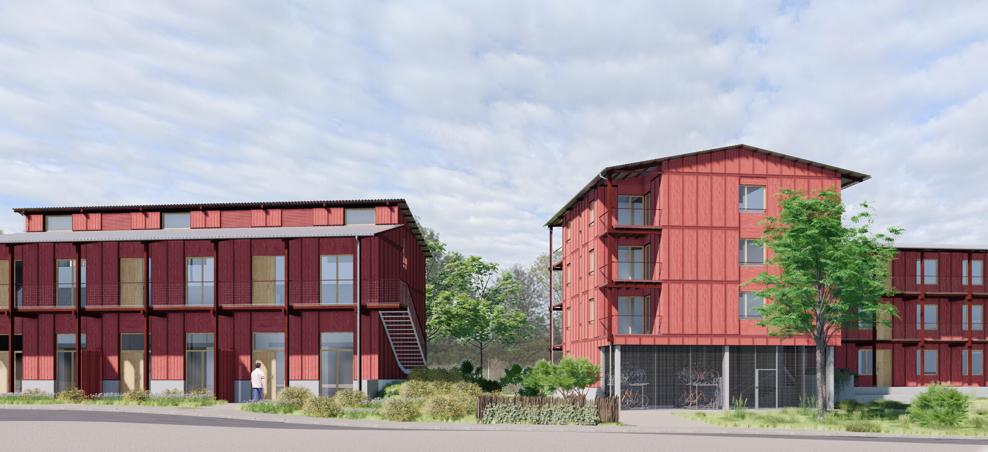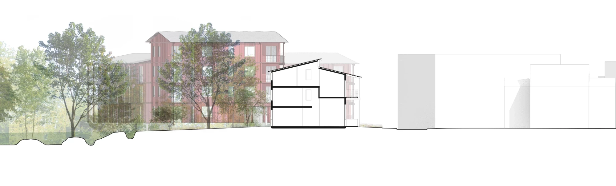 Le projet s’inscrit dans cette logique : les désaxements des volumes et des cheminements permettent de créer une composition organique au service du « plaisir de l’œil » des usagers, tout en tirant parti des vues sur le grand paysage au nord du site. Les variations volumétriques des constructions contribuent à l’animation de la rue René Dumont et du Chemin creux longeant le champ situé à l’est. L’épannelage contribue à combiner les différents registres de hauteurs présents dans le quartier. Au sein de la parcelle, les découpages judicieux et les jeux de toitures participent à la silhouette urbaine du projet et à l’identification des logements.