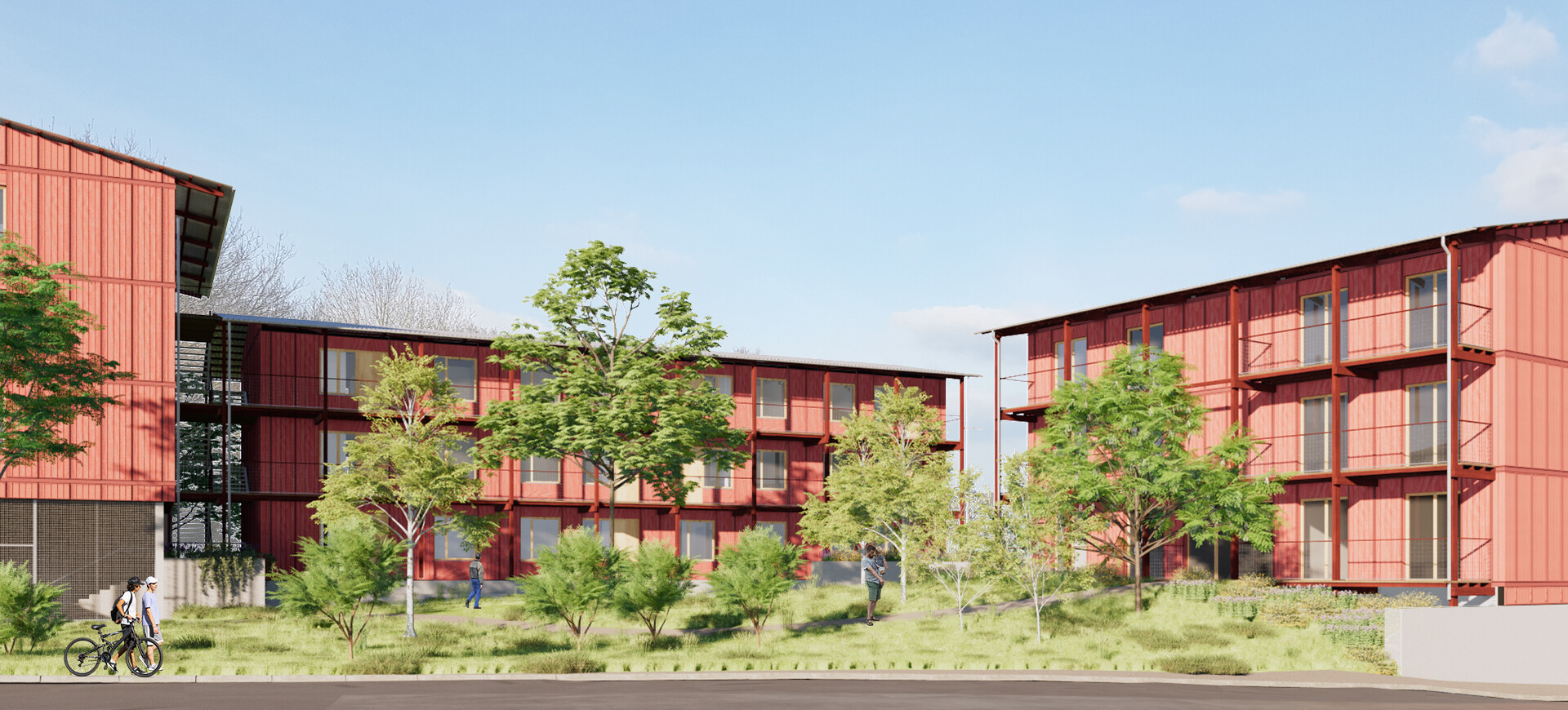 Le parvis d’entrée est l’espace privilégié des rencontres. Le traitement des frontages permet une mise à distance des logements situées au rez-de-chaussée et un passage progressif du collectif vers le privatif. Le projet bénéficie de la topographie existante qui, par la présence d’un fossé, amène de l’intimité dans les jardins privatifs situés en vis-à-vis du chemin creux. Ce dispositif paysager permet de minimiser le recours à des clôtures, contribuant à l’intégration paysagère du projet dans son site. Les déblais générés par le creusement du parking sont également réemployés pour créer des modelés de terrain, participant à la qualité paysagère de l’ensemble et à la gestion des vis-à-vis.