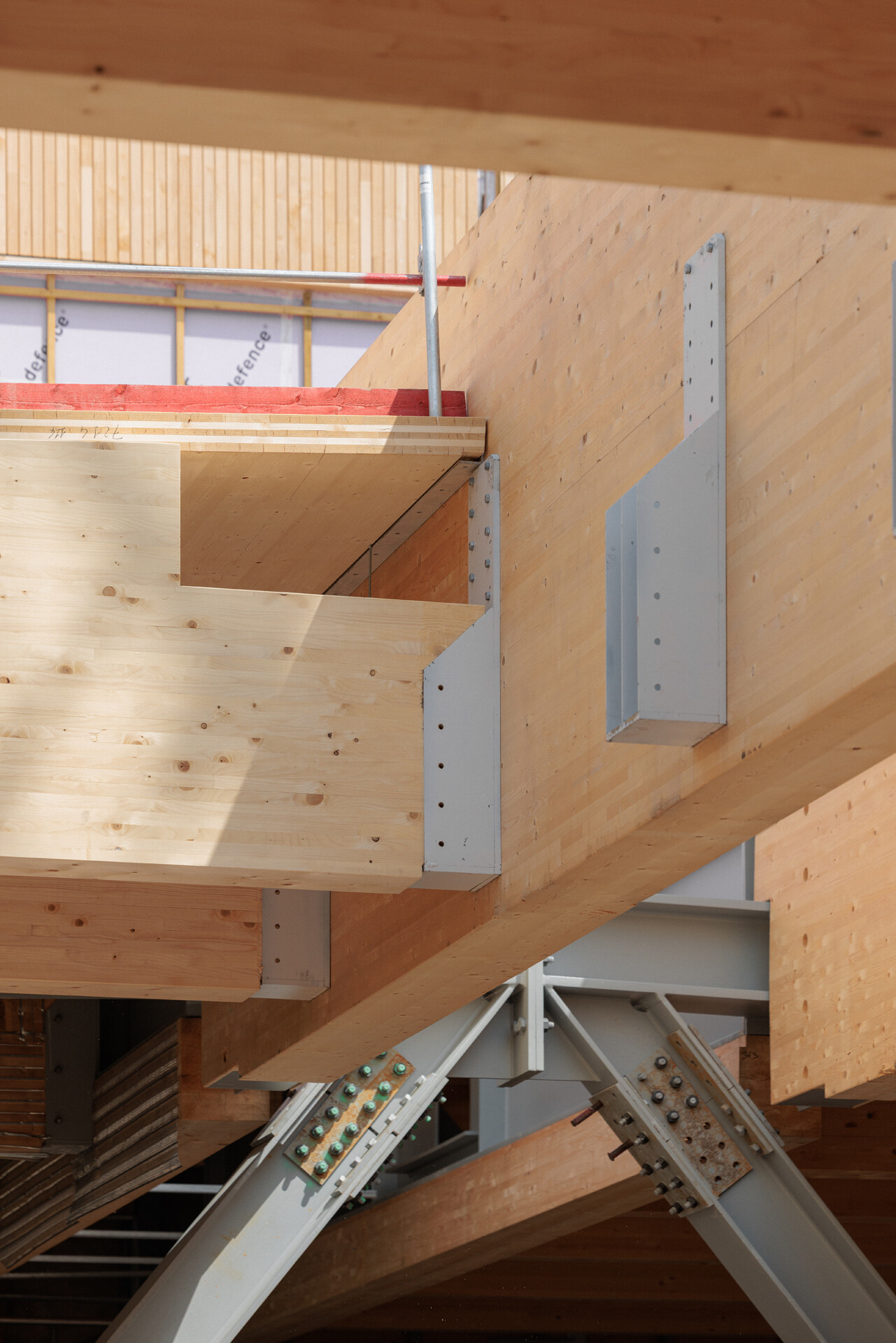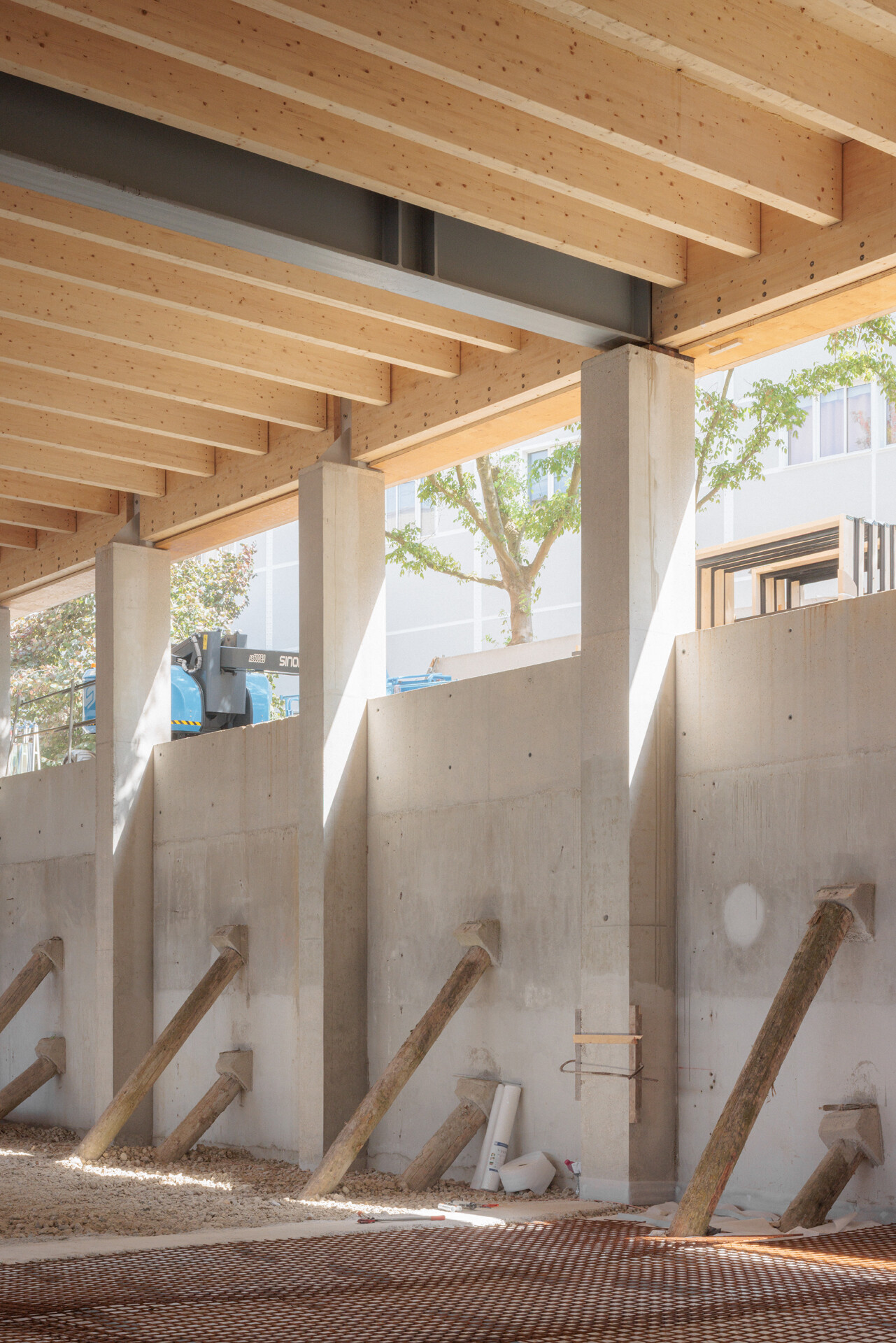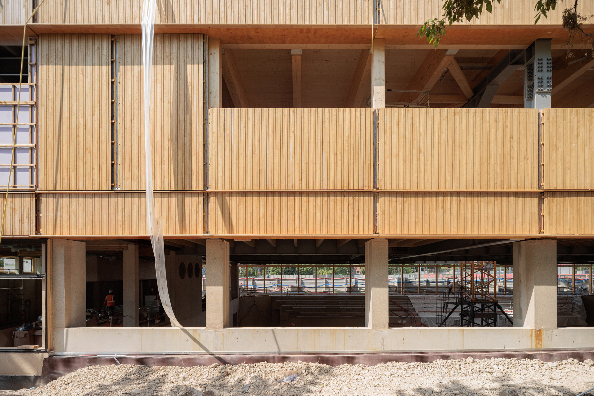 Le bâtiment combine un socle minéral ancré dans le sol et une superstructure légère en bois soutenus par deux larges piles regroupant les services et les circulations verticales. L’ensemble des soubassements est traité en béton architectonique quand les façades des niveaux supérieurs sont revêtues d’un bardage en liteaux de châtaignier naturel dont le calepinage et les variations de sections accrocheront la lumière en fonction des orientations et de la temporalité.