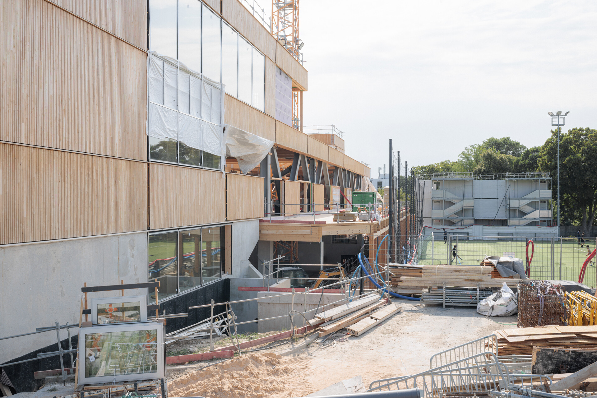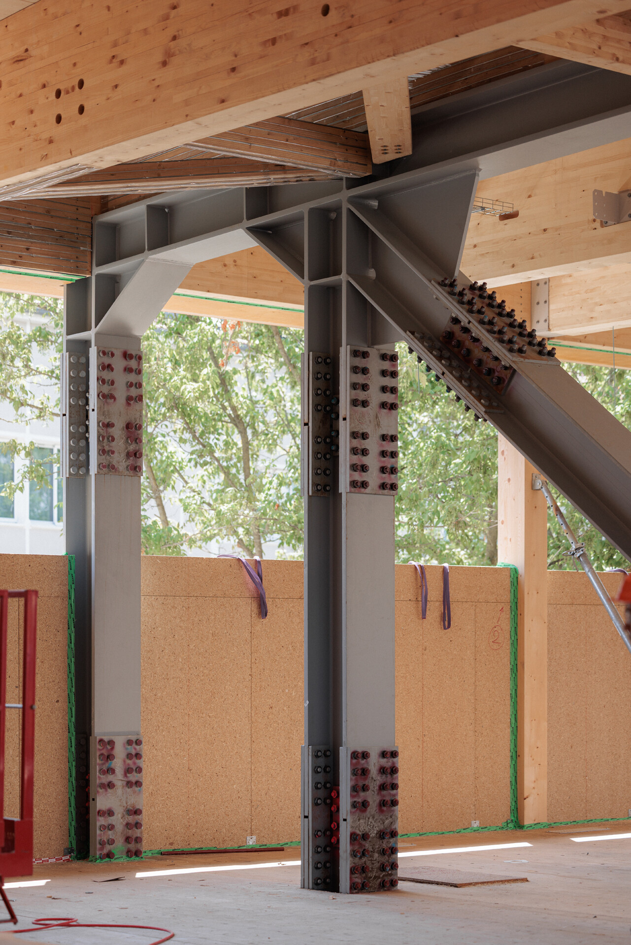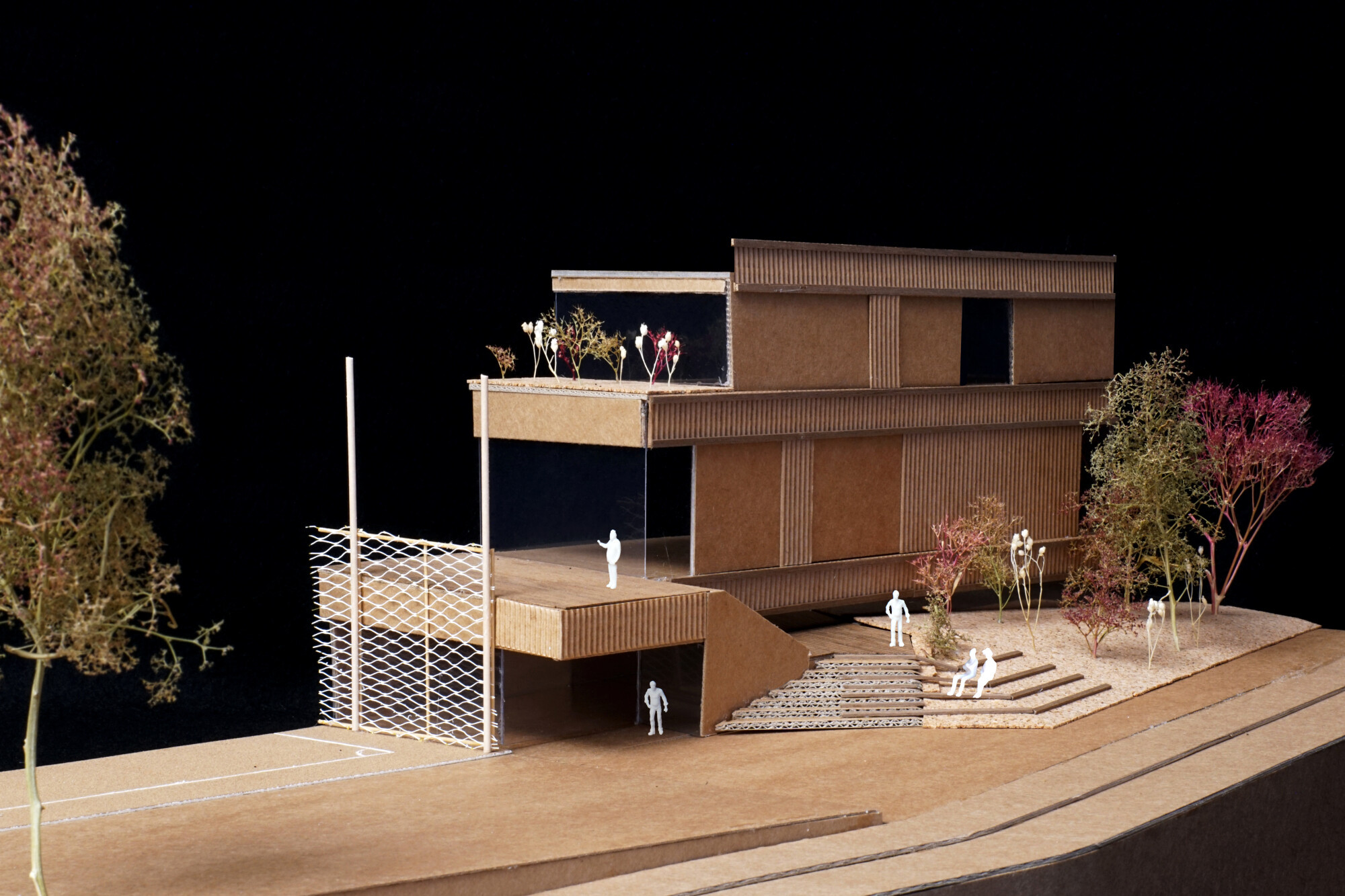 Le bâtiment combine un socle minéral ancré dans le sol et une superstructure légère en bois soutenus par deux larges piles regroupant les services et les circulations verticales. L’ensemble des soubassements est traité en béton architectonique quand les façades des niveaux supérieurs sont revêtues d’un bardage en liteaux de châtaignier naturel dont le calepinage et les variations de sections accrocheront la lumière en fonction des orientations et de la temporalité.