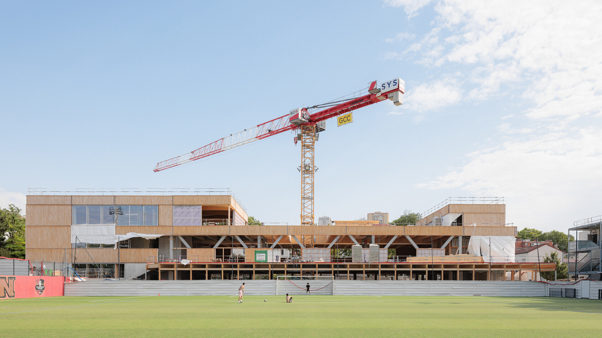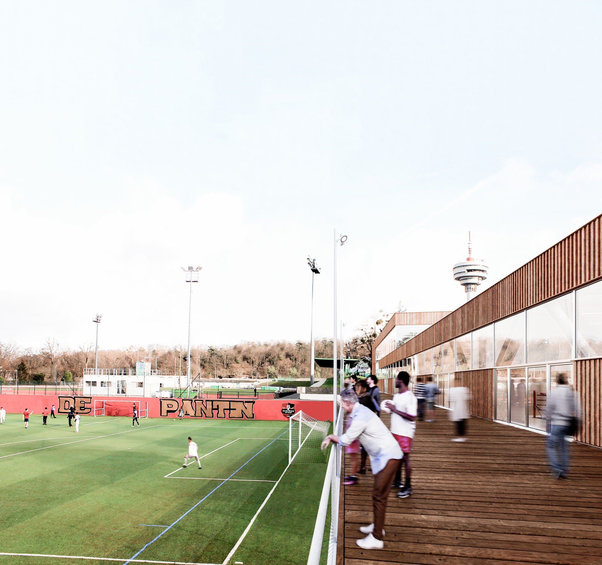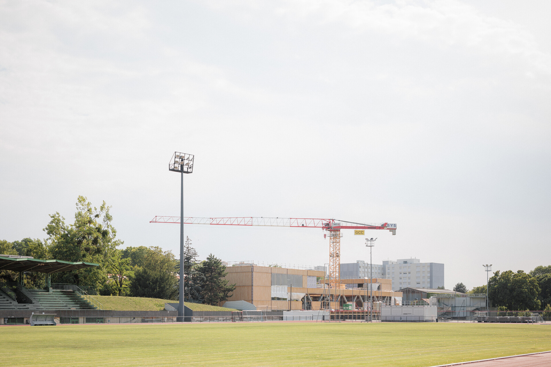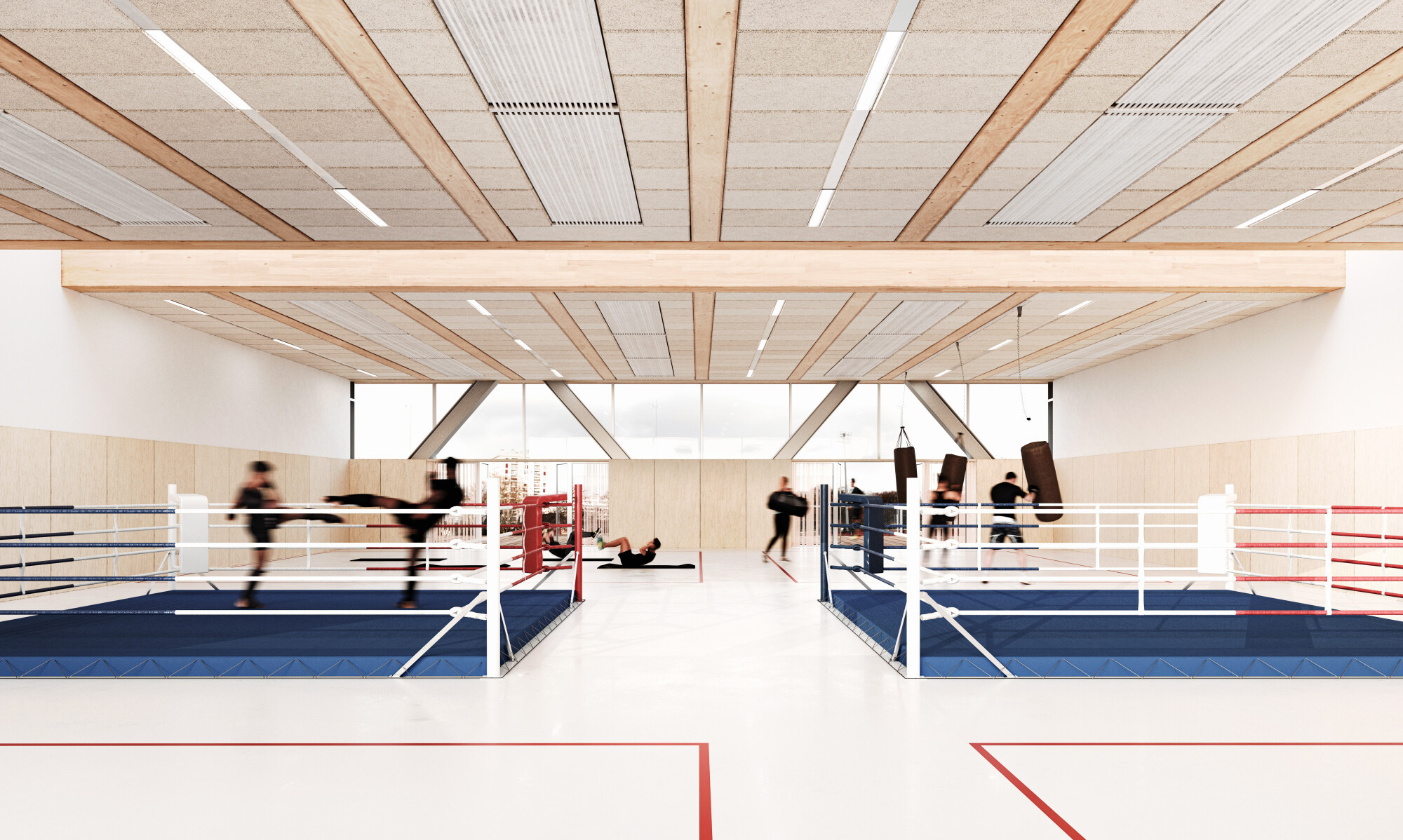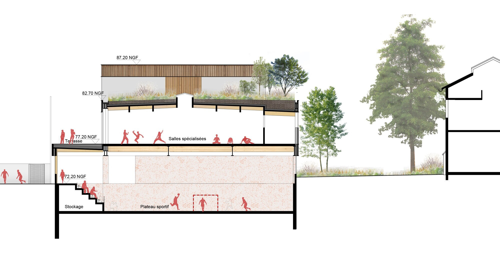Conçu comme un bâtiment paysage, le projet s’attache à proposer des strates successives de sols habités qui s’ouvrent sur l’extérieur et qui offrent chacune des perceptions singulières du site. La halle a été conçue pour offrir une multitude d’usages et pour favoriser l’échange et le partage. La variété de déambulations s’accompagne de nombreuses transparences mettant en relation les différentes pratiques sportives qui cohabitent sur le site. L’interaction entre les publics est recherchée par un enchaînement d’espaces communs le long de l’axe est-ouest, du parvis au belvédère jusqu’à la place centrale. Le parvis, qui se prolonge par une coursive à l’intérieur du bâtiment, met en relation le terrain de foot extérieur au terrain multisport situé en contre-bas. Au nord, une promenade généreuse surplombe le terrain de football et met en relation visuelle l’ensemble des activités sportives possibles sur le site. Les locaux associatifs et dojo sont ouverts sur une vaste toiture végétalisée.