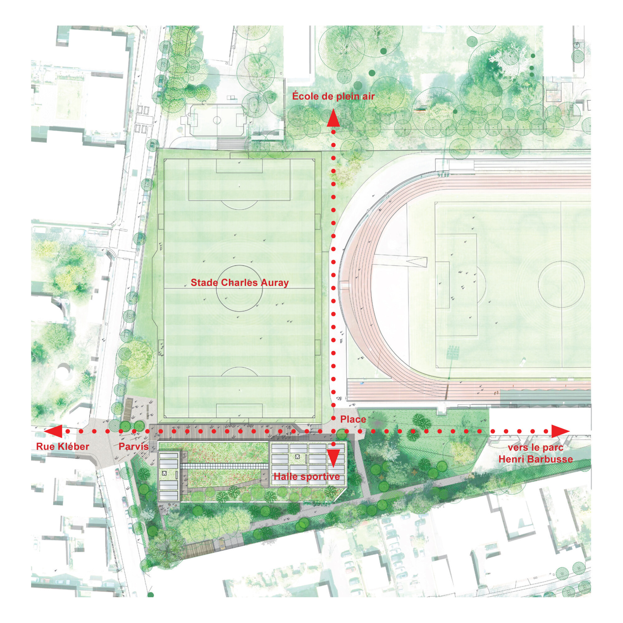 Le projet de construction d’une halle sportive vient apporter du dynamisme et une nouvelle structure paysagère cohérente à un quartier pavillonnaire pantinois. Implanté dans la profondeur du site et partiellement enterré, le bâtiment présente une hauteur proche des gabarits voisins. Son implantation dans la continuité de la rue Kléber marque le pied du coteau de Romainville et esquisse un lien vers le parc Henri Barbusse.