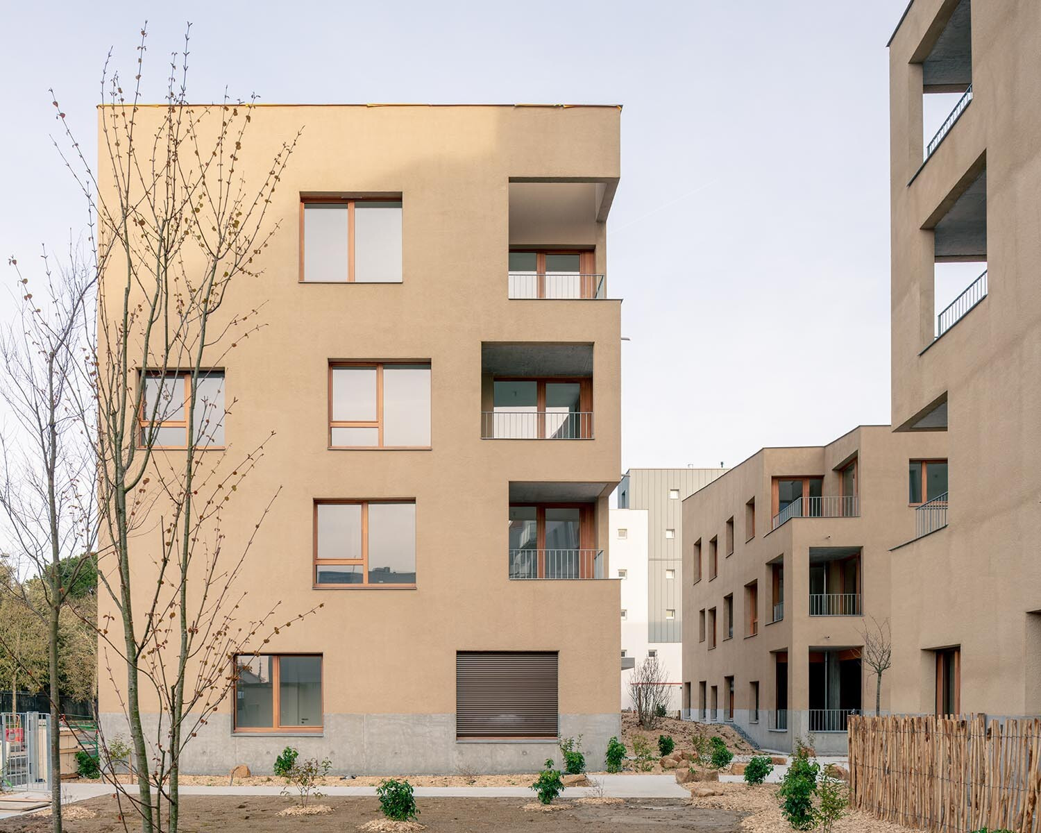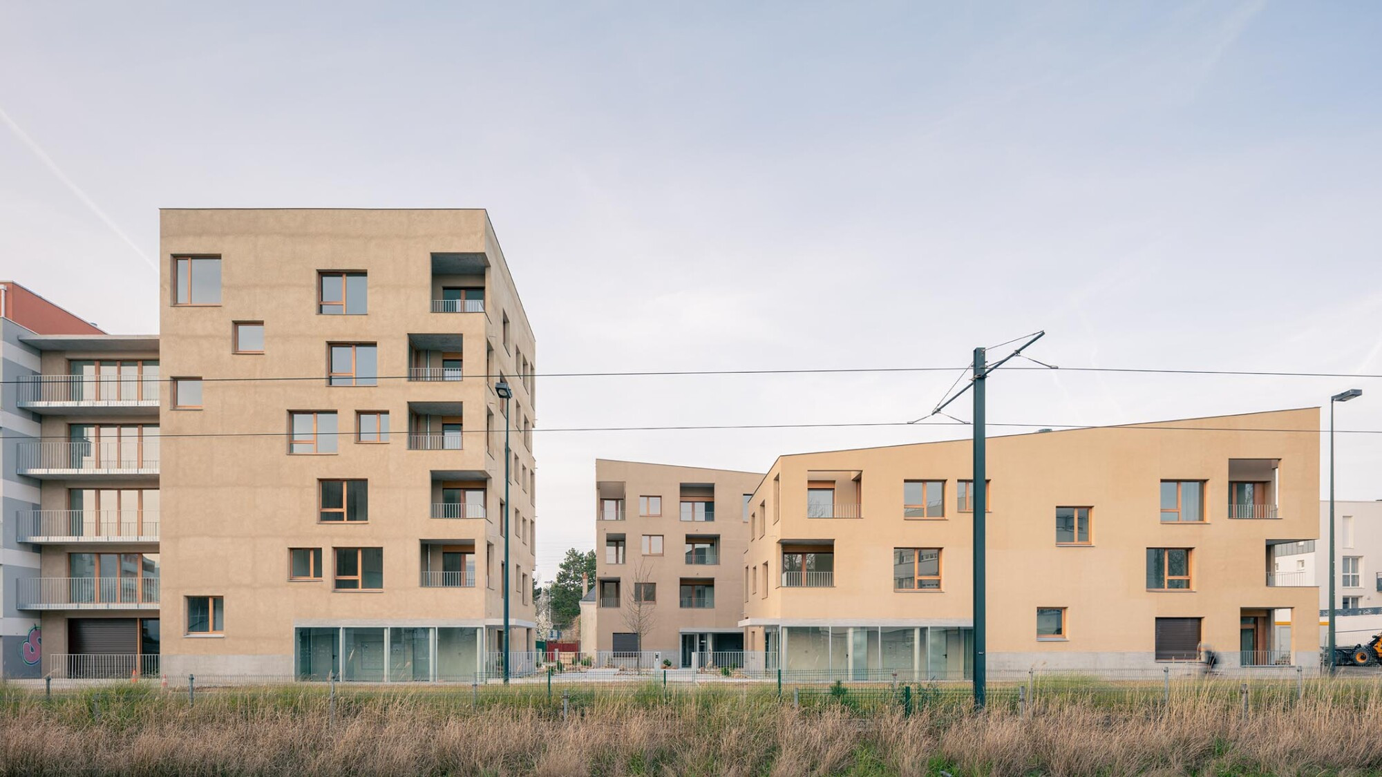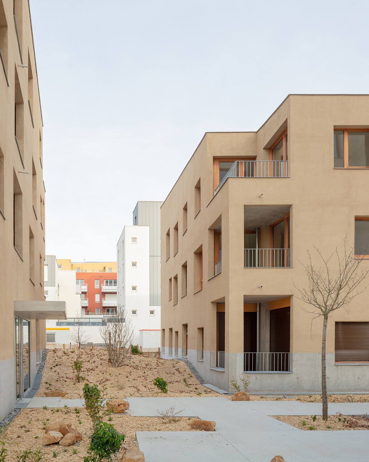 Le projet est composé de trois bâtiments monolithiques avec des volumétries simples et compactes qui s’articulent autour d’une place centrale et de manière à offrir une profondeur de champ et ainsi animer le boulevard. Les entrées des immeubles donnant sur le parvis de cœur d’îlot sont soulignées par des casquettes en béton. Des galeries éclairées naturellement regroupent les éléments de services tels que les accès aux locaux et les boîtes aux lettres. Elles sont traitées comme le prolongement de l’espace extérieur et créent un lien entre la place centrale et les halls menant aux logements.